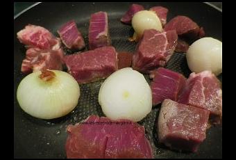 En una sartén con el aceite salteamos la carne y las cebollitas, hasta que se dore la carne (2 minutos). Salpimentamos.