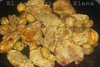 - En una sarten calentamos el aceite y doramos los ajos, una vez dorados añadimos las rodajas de solomillo y un poco de orégano, freímos hasta que estén dorados. Cuando veamos que le queda poco al solomillo le agregamos los champiñones ya cocidos y salteamos.
