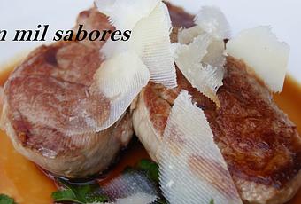 Con las fotos de Aracena me pasa lo del perro de Pavlov, que todo es mirarlas y empiezo a salivar, cuanta delicia junta!!!!.... risotto de setas con aceite de trufa, musaka de berenjenas con setas y gratinado de queso de cabra, queso frito de la zona con mermelada de tomates, revuelto de gurumelos con Ibérico, lagartitos Ibéricos, paté de perdiz con mermelada de pimientos, mini hamburguesa de solomillo ibérico con mermelada de beicom......Los dulces no os los pongo porque no tengo tan mala leche, pues solo redactando la entrada casi me electrocuto con el ordenador con las babas.Os dejo esta receta que preparé con el solomillo Ibérico que me traje.Ingredientes:Para la reducción de vino de naranja:Un vaso grande de vino de naranja.Una cucharada de azúcar.