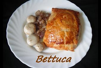 Cortamos la plancha de hojaldre en rectángulos y procedemos al montaje, colocamos un filete de solomillo , relleno y otro filete de solomillo (como si estuviéramos montando una lasaña), envolvemos con el hojaldre pintándole los bordes con huevo para sellarlo bien, cerramos y pintamos con el huevo .