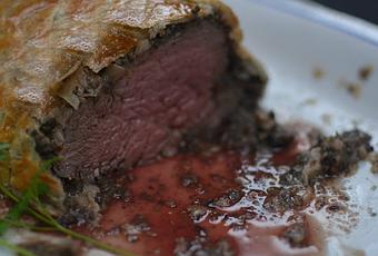 Precalienta el horno a 200º. Extiende la masa de hojaldre en la bandeja de hornear. Coloca encima en la parte central una mezcla de champiñones y foie. Pon encima la carne y cubre con otra capa de champiñones y foie. Cierra el hojaldre con cuidado dejando la unión en la parte inferior. Bate el huevo y con una brocha de cocina pinta el hojaldre. Hornea durante 20 minutos y antes de comer deja que repose unos 10 minutos.