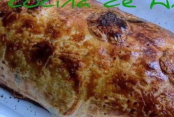 - Untar la carne con la pasta preparada y poner sobre el hojaldre, enrollar y cerrar bien. Adornar con los recortes de masa, pegándolos con clara de huevo, y pintar todo con yema batida. Pinchar con un tenedor y hornear a 200º unos 30´, hasta que esté bien dorado.