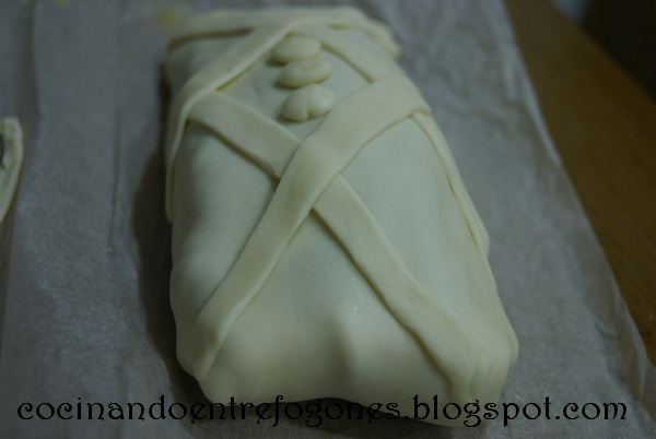 7. Le damos la vuelta con mucho cuidado, para que nos queden las juntas por debajo.Decoramos a nuestro gusto con el hojaldre sobrante.