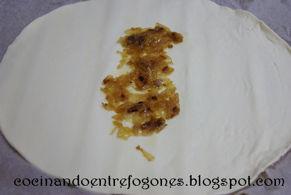 3. Abrimos nuestra plancha de hojaldre, y colocamos en el centro la cebolla caramelizada ya fría.