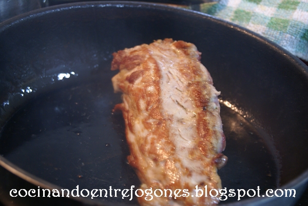 2. Para el solomillo ponemos una sarten a fuego fuerte con un chorro de aceite de oliva y vamos sellando todas las caras del solomillo durante unos minutos por cada cara. Hasta que este tostadito.