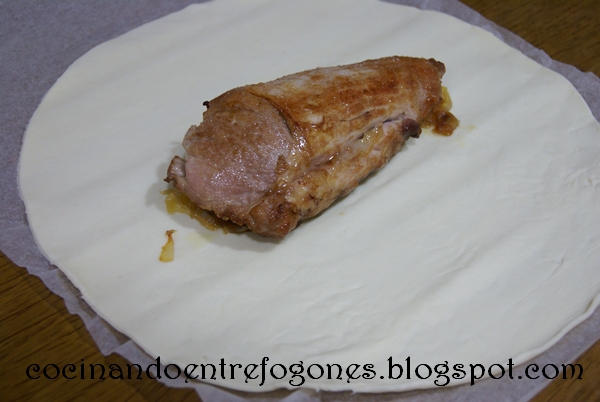 4. Encima colocamos el solomillo de cerdo, ya frío y reposado.Recorta los excesos de hojaldre que luego usaremos para decorar.