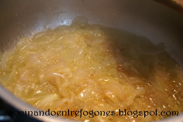 1. Ponemos una cazuela al fuego, con un chorro de aceite de oliva y la mantequilla, cuando se forme una espumilla añadimos la cebolla picada finamente en juliana y añadimos una pizca de azúcar y una pizca de sal y dejamos pochar a fuego lento durante 20 minutos tapada.