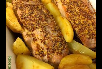 - Los unto con mostaza antigua generosamente por todos sus lados y los pongo sobre una fuente que pueda ir al horno untada con aceite