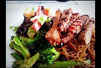 Sirve los fideos, sobre ellos las tiras de solomo y acompaña con una rica ensalada y/o verduras.