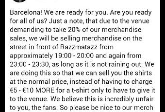 El caso es que he visto eso en Twitter y me ha parecido llamativo...y muy loable por su parte. Lo he visto para ser mas exactos aquí. El merchandise de las bandas es caro, pero las bandas es cierto que de esas ventas solo ver una fracción, ya que entre pitos y flautas las ganancias se van por otras partes. Y al final los fans tienen que pagar unos sobreprecios excesivos por lo que compran. Y visto que la sala barcelonesa Razzmatazz (Una de las mas míticas del territorio español), según el grupo les 20% por vender dentro de su recinto...la medida tomada por la banda de vender merchandise fuera del local para que la gente se lo saque mas barato me parece que mas que es lógica y acorde.