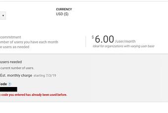 Este error significa que estás intentando aplicar el código promocional Google Workspace en otro país diferente. Como ya sabes, los códigos promocionales de G Suite son exclusivos para cada país. Por ejemplo, si tienes un código promocional de G Suite para USA y quieres aplicarlo en la cuenta del G Suite de España, simplemente no funciona. Por lo tanto, necesitas solicitar un código promocional de G Suite para España y así obtener un 10% de descuento durante el primer año.