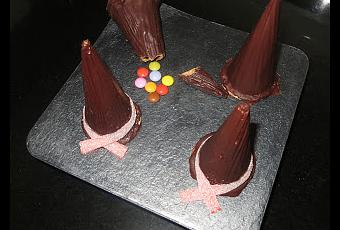 Elaboración:Lo primero que hacemos es calentar el chocolate al microondas o al baño maría. Rellenamos nuestros conos de lacasitos y gominolas.Ponemos encima de cada galleta una cucharada de chocolate y alisamos. Colocamos la galleta encima del cucurucho y le damos la vuelta. La colocamos encima de un papel de horno y la metemos a la nevera durante diez minutos hasta que el chocolate se solidifique.