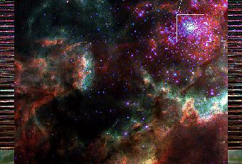 Pero en lugar de eso, 30 Doradus se encuentra en la Gran Nube de Magallanes, una galaxia satélite de la nuestra que emite sólo una décima parte de luz que la Vía Láctea. Las estrellas recién nacidas, de 30 Doradus han establecido una esfera de gas en un área de 700 años luz de ancho, 30 veces el diámetro de la bien conocida nebulosa de Orión.