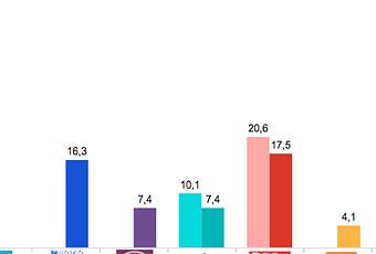 - Por último el BNG lograría salvar la situación al obtener el 7,4% de los votos y retener 5 de los 7 escaños que obtuvo en 2012 mientras que Ciudadanos, con el 4,1% de los votos, continuaría sin representación en la asamblea gallega.