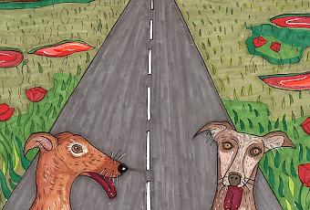Como si se tratase de un espejismo, ante mi aparecieron dos galgos sentados en medio de la carretera. Frené bruscamente atravesada por la mirada de uno de ellos.