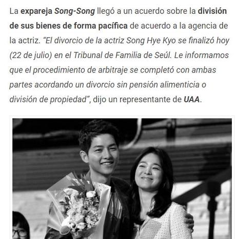 A casi un mes de haberse conocido la solicitud de divorcio por parte del actor Song Joong Ki a su exesposa Song Hye Kyo , hoy por fin se dio a conocer que los protagonistas de 'Descendants of the Sun' están oficialmente divorciados tras haberse resuelto la división de sus propiedades.