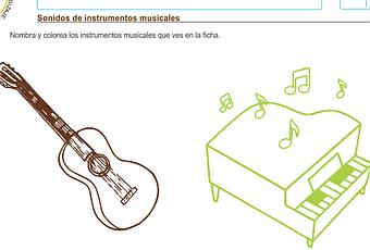Actividad a realizar: Nombra y colorea los instrumentos musicales que ves en la ficha.