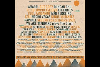 El Sonorama Ribera, que se celebrará del 13 al 16 de agosto en Aranda de Duero, incorpora a su cartel a Duncan Dhu, Cut Copy, Tachenko, Najwa Nimri, Panamá, Jay Malinowsky, The Corner y Exsonvaldes. Todos ellos se suman a un cartel que cuenta ya con nombres como Raphael, Iván Ferreiro, Amaral, Nacho Vegas, Izal, Fuel Fandnago y muchos más. Toda la información está en la página web del festival www.sonorama-aranda.com.