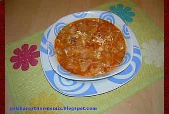 5. - Cuando acabe el tiempo programado paramos la máquina e incorporamos los huevos si los queremos en hilos, y mezclamos durante 5 seg., vel. 2. [Si no los queremos en hilos los incorporamos junto con el pan sin mezclar y los dejaremos reposar unos minutos dentro del vaso, sin bajarlo de la máquina.]