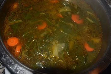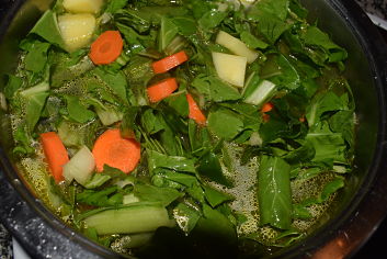 Echa el caldo ( si no tienes caldo pon agua ) y agrega las acelgas reservadas y sal al gusto.