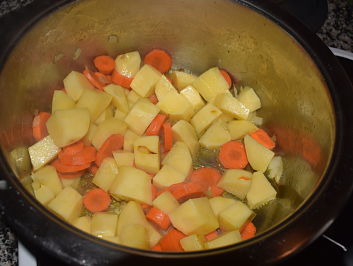 Lava y trocea las acelgas. Reserva. Yo no pongo las pencas, éstas las rservo para elaborar otros platos. Pon a calentar Aove en el fondo de una cazuela. Añade la cebolla picada y los ajos laminados. Espera a que se doren e incorpora las patatas troceadas y las zanahorias en rodajas. Rehoga todo junto unos 5 minutos a fuego medio-bajo.