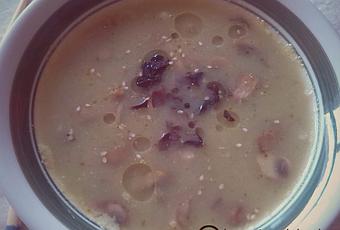 1/2 puerro1/2 calabacín5-6 setas shiitakeUn trocito de hinojoAlgas de tu elección: wakame, kombu, dulse... Nosotros hemos elegido kombu y dulse.Aceite de oliva virgen extraSal marina atlánticaJengibre en polvoPimienta negra molida500-600 ml de agua (La cantidad de agua es un poco orientativa. Si ves que te queda muy espeso, añade un poco más)Semillas de sésamoAceite de sésamoPREPARACIÓNPonemos las algas en remojo en un bol con agua.En una olla, ponemos un chorrito de aceite. Añadimos la cebolla, el puerro, el calabacín y el hinojo lavados y picados. Echamos sal, pimienta y jengibre al gusto y pochamos 4-5 minutos, removiendo de vez en cuando. Añadimos el agua y dejamos que cueza a fuego medio unos 10-15 minutos.Transcurrido ese tiempo, trituramos con la batidora. Nos tiene que quedar de consistencia más bien líquido, de lo contrario sería un puré.Limpiamos y picamos las setas. Las saltemos en una sartén durante 2-3 minutos con un poquito de aceite. Reservamos.Servimos la sopa en cuencos, añadimos las setas salteadas y las algas escurridas. Decoramos con semillas y un chorrito de aceite de sésamo.