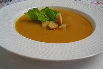 PREPARACIÓNEn una cazuela, con un poco de aceite de oliva, freímos la rebada de pan. Ya tostada, la sacamos y la ponemos sobre papel para que absorba el aceite sobrante. En la misma cazuela, ponemos a rehogar el apio, los dientes de ajo, las zanahorias y el nabo cortado todo a trozos menudos. Cuando veamos que está todo bien pochado, le añadimos la mitad del caldo vegetal y lo dejamos a fuego medio unos 10 minutos.Una vez pasado ese tiempo, ponemos todo (la rebanada de pan, también) en el vaso de la batidora y lo trituramos todo muy bien. Lo echamos de nuevo en la cazuela y le añadimos el resto de caldo. Rectificamos de sal, y lo dejamos a fuego medio. Cuando comience a hervir lo dejamos unos 5 minutos, apagamos el fuego y a servir.Acompañamos con unos costrones de pan y una ramita de apio.