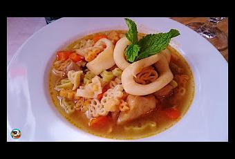 Sopa de calamares con pescado, verduras y pasta. Un plato muy sabroso y completo para alimentar bien a toda la familia.