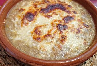 Ingredientes para 4 personas:4 cebollas blancas grandes2 dientes de ajos2 litros de caldo de pollo o carne300 ml de vino blanco60 g de mantequilla sin lactosa40 ml de aceite de girasol300 g queso emmental ralladoPimienta molidaSalElaboración:Pelar y cortar las cebollas en juliana. Pelar y picar los ajos finamente.Dejar el pan cortado en lonchas pequeñas y finas.Poner en una cazuela la mantequilla y el aceite. Cuando esté derretida la mantequilla, añadir la cebolla y dejar pochar a fuego suave unos 45 minutos. Incorporar el ajo picado, salpimentar, antes que coja color el ajo, agregar el vino blanco.Dejar evaporar el alcohol del vino.Incorporar 1,5 litros de caldo y dejar cocer la cebolla 30 minutos sin tapar.Añadir el pan cortado, cocer 5 minutos más. Si es necesario por espesar mucho la sopa, añadir más caldo caliente.Rectificar de sal si es necesario.