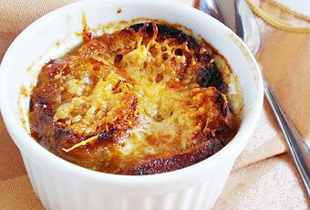 Con esta sin huevo sopa de cebolla a la francesa he encontrado la solución, se puede esperar en el horno tranquilamente.