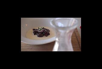 Colocamos la sopa en una jarrita. Servir el plato por separado de la sopa. Volcar la sopa en el plato una vez servido en la mesa volcando por el exterior con cuidado de no descolocar las cerezas.