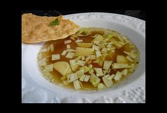 En una olla grande con abundante agua agregamos el muslo de gallina, el esqueleto de pollo, sal y 2 hojas de hierba buena. Cocemos durante 10 minutos, colamos y reservamos.