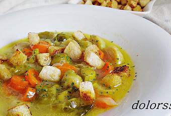Ingredientes para 4 personas: 250 gr. de coles de Bruselas1 cebolla1 puerro 1 tomate grande2 zanahorias1 l. de caldo de pollo3 filetes de polloperejil picadosal, pimienta, comino dos rebanadas de pan de molde s/caceite de oliva virgen extra