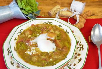 INGREDIENTES:- 1l. de caldo de verduras o pollo.- Un manojo de espárragos verdes finos.- 5 o 6 dientes de ajos.- 150gr. de taquitos de jamón serrano.- 4 huevos.- Un bollo de pan o media barra.- Una cucharadita de comino.- Sal.- Aceite de oliva.