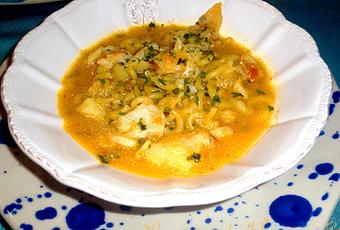 La receta de esta sopa de fideos gruesos con bacalao me llegó por Whatsapp. Mi marido estaba ojeando una revista en casa de sus padres, le hizo una foto, me la mandó y me dijo ¿Me haces este plato? La respuesta como véis es obvia, pero perdonar que no mencione a la revista porque estoy harta. Harta de encontrarme recetas a las que han quitado varias líneas para que les cuadre la maquetación. Recetas con una foto maravillosa pero que si te la vas a comer seguro que la carne está cruda, recetas que utilizan la foto de otra receta (tengo varias pruebas) por lo que evidentemente a ti no te va a salir lo que estás viendo y que te has puesto a cocinar porque te ha entrado por los ojos. Y recetas como esta que por la foto pensaba que era una especie de fideuá caldosa y que me tocó ir modificando todas las cantidades para no cargarme la receta.Este es el plato que salio después de todas las modificaciones.
