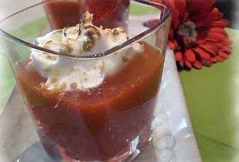 Merengue: batiremos la clara con el azúcar apunto de nieve bien fuerte y una pizca de sal para que quede bien firme. Con la ayuda de dos cucharas le damos forma y lo colocamos sobe un plato donde espolvorearemos azúcar y quemaremos con un soplete.Para montar la copa, vertemos la crema de fresa, ponemos la bola de merengue y espolvoreamos el crocanti Servir y tomar bien frío.
