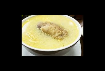 La gallina, limpia y troceada, se pone en una olla grande con dos litros y medio de agua, la carne corte en trozos grandes y el jamón; se sazona con un poco de sal y se deja hervir. Se va espumando y, a media cocción, se le añaden la cebolla entera con los clavos incrustados, el apio y los puerros. Tiene que cocer bien hasta que las carnes qu completamente blandas. vez en su punto, se retiran todos los ingredientes y el caldo consumado se pasa por un colador. En caso de quedar con grasa, es necesario desengrasarlo. Se sirve templado o caliente; se le pueden agregar trocitos de las carnes cocidas. En lugar de gallina, se pueden poner dos o tres perdices.