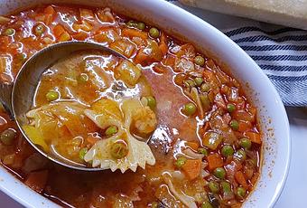 2.-Incorporamos los guisantes y los lazos de pasta. Cubrimos todo con caldo de verduras, dejamos que todo se cocine 10 minutos, pasado ese tiempo añadimos la gambas y cocinamos la sopa de verduras 5 minutos más. Apagamos el fuego y dejamos reposar la sopa unos minutos.