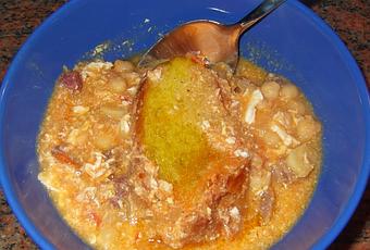 A continuación, agregamos el caldo y los garbanzos. Mientras se cuece durante diez minutos, colocamos aceite de oliva en otra sartén y doramos las rebanadas de pan.Pasado los diez minutos, echamos el pan dorado y luego los huevos, le damos varias vueltas a los huevos para que se deshagan en la sopa y cuando veamos que están cocinados ya está la sopa lista para servir. Un plato muy nutritivo y completo que encantará a toda la familia.