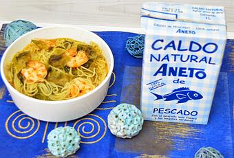 INGREDIENTES:- 1litro de caldo de pescado Aneto.- Algas variadas.- 500gr. de langostinos.- 200gr. de fideos chinos. PREPARACIÓN:Pelamos los langostinos y la cascaras y las cabezas las ponemos en un cazo con un poco de caldo hasta que hierva. Machacamos las cascaras y las cabezas con un tenedor para sacarle todo el jugo, lo colamos y lo ponemos con el retos del caldo que lo hemos colocado en una olla, ponemos a hervir y entonces añadimos los langostinos, las algas y los fideos chinos cocemos durante 5 minutos y listo, ya tenemos nuestra sopa.Veis os lo dije, rápido, rápido y fácil, fácil......