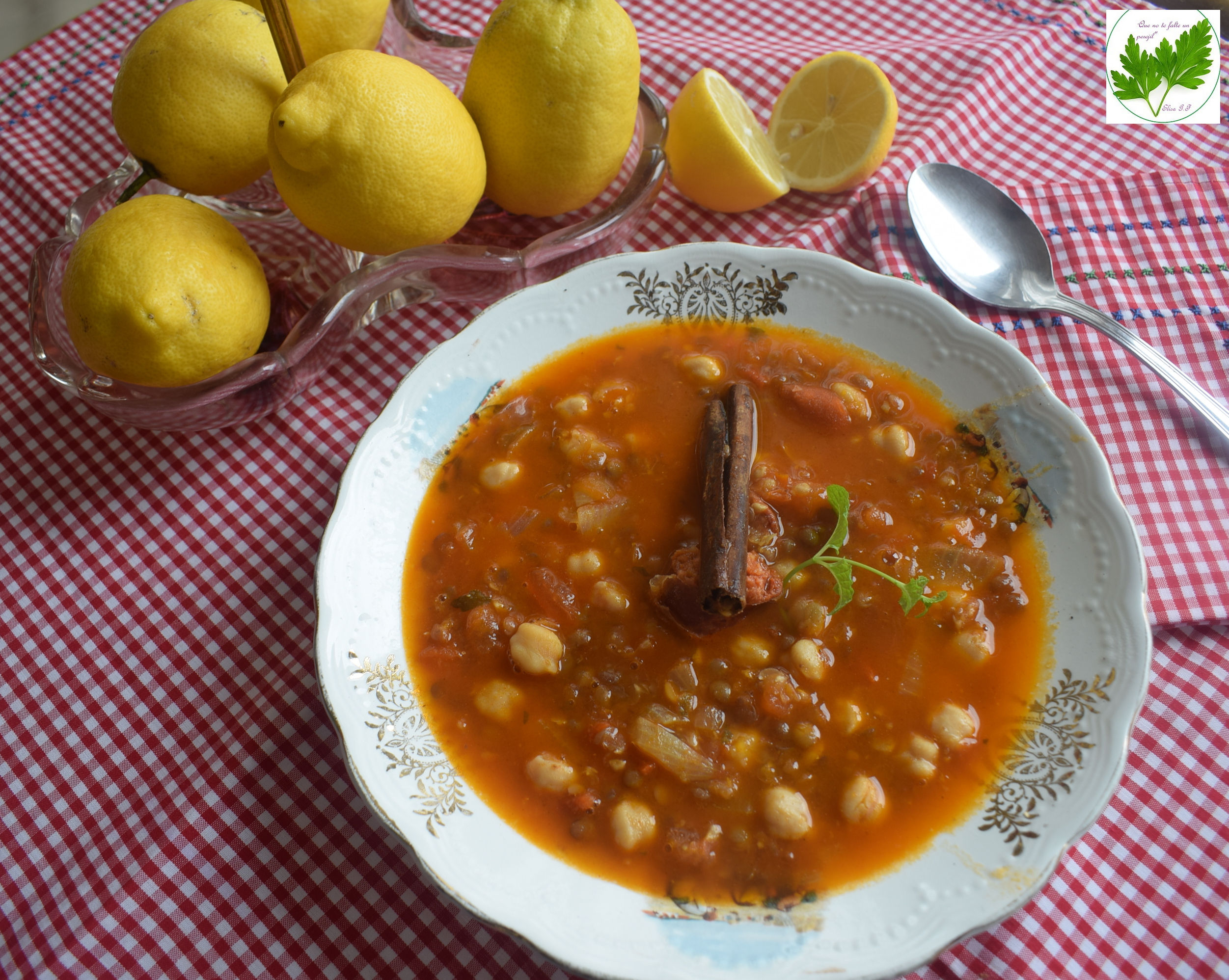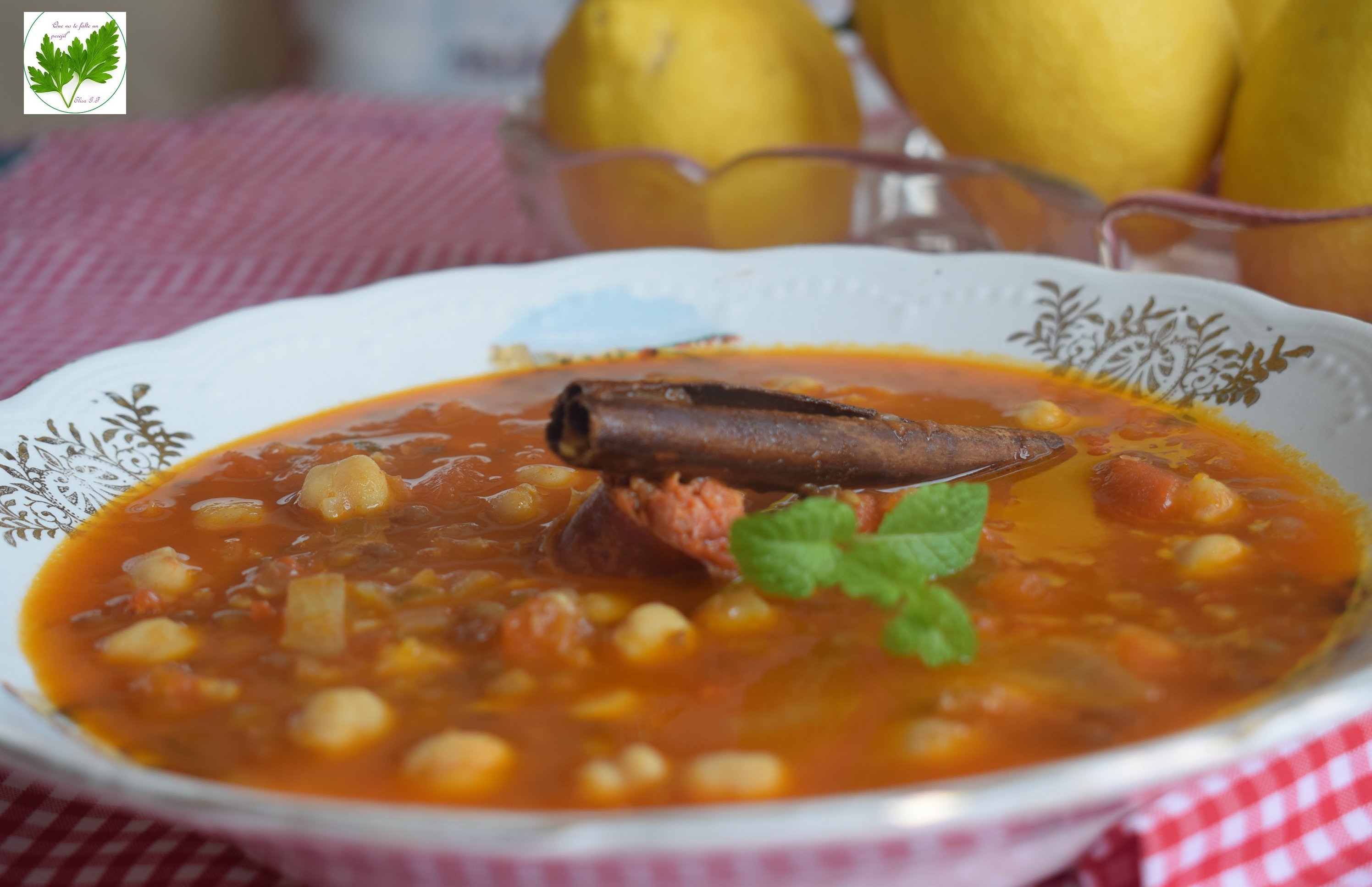 PREPARACIÓNPon a calentar 2 cucharadas de aceite en el fondo de una cacerola. Añade la cebolla muy picadita y los dientes de ajos laminados. Cuando adquiean color añade el chorizo cortado en rodajas. Rehoga todo junto a fuego lento durante unos 5 minutos. Incorpora el comino, cilantro, canela, guindilla, pimentón dulce y los tomates pelados y troceados pequeños. Continúa rehogando y cuando los tomates estén sofritos añade la cucharada tomate frito, las legumbres cocidas y cubre con el caldo. Sube el fuego a medio-alto, espera a que hierva, pon sal y pimienta. Baja el fuego y cuece durante 15 minutos más.Sirve en platos soperos con un chorrito de zumo de limón.