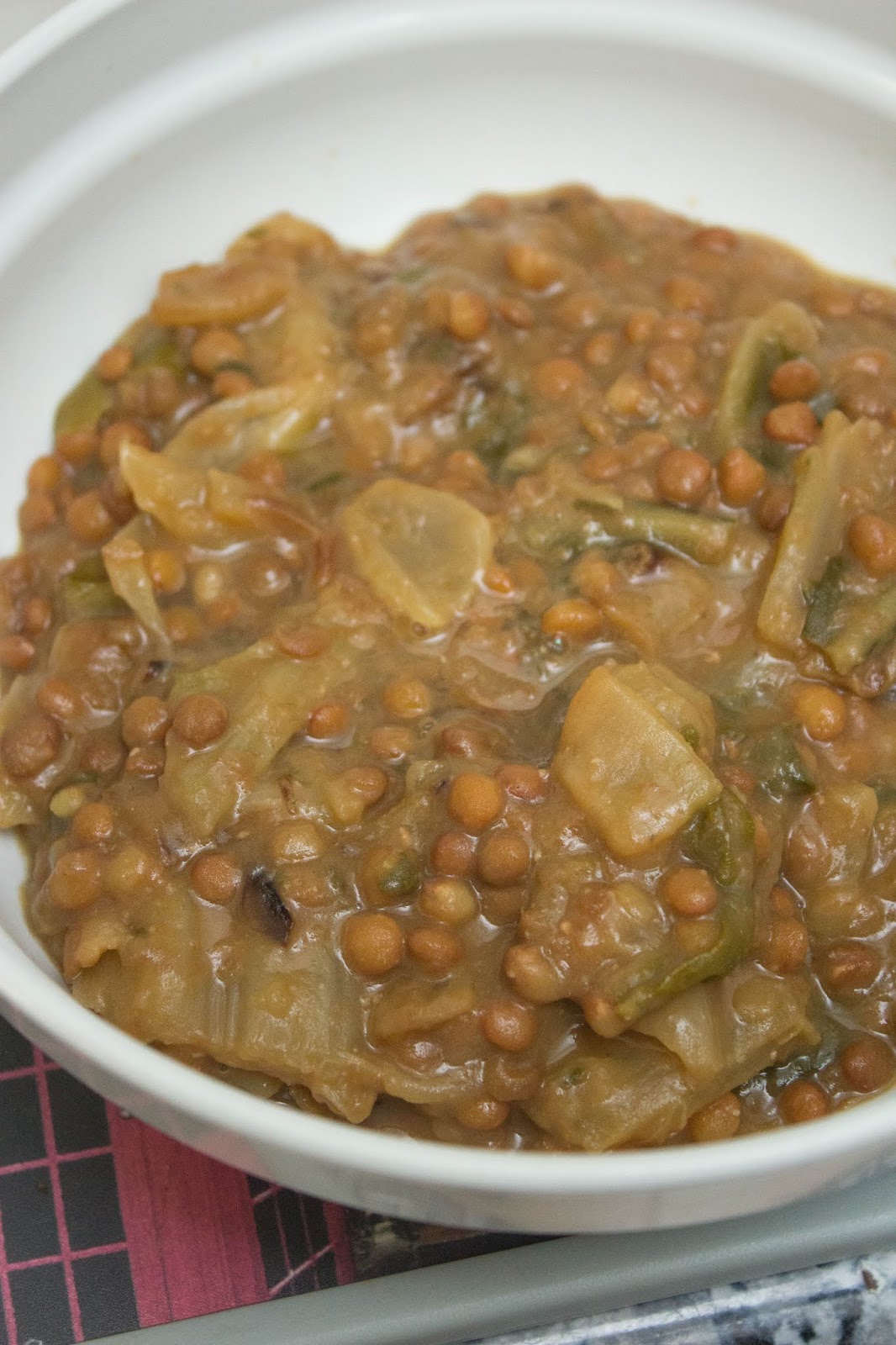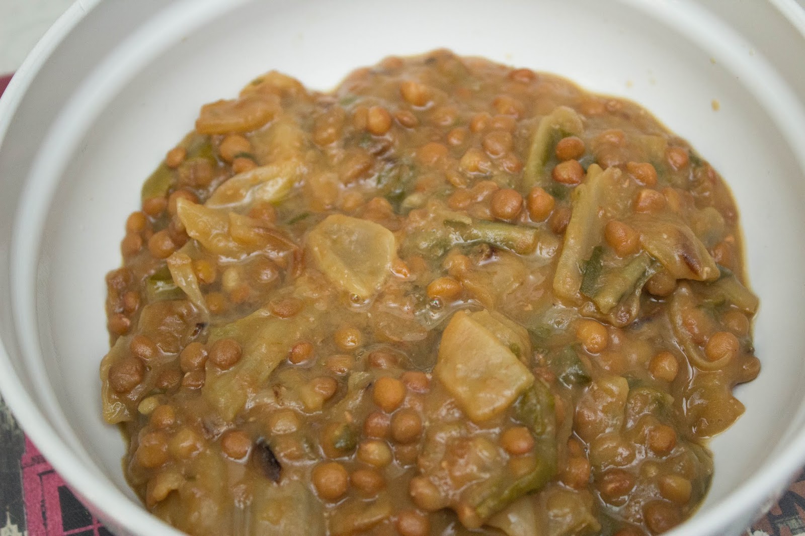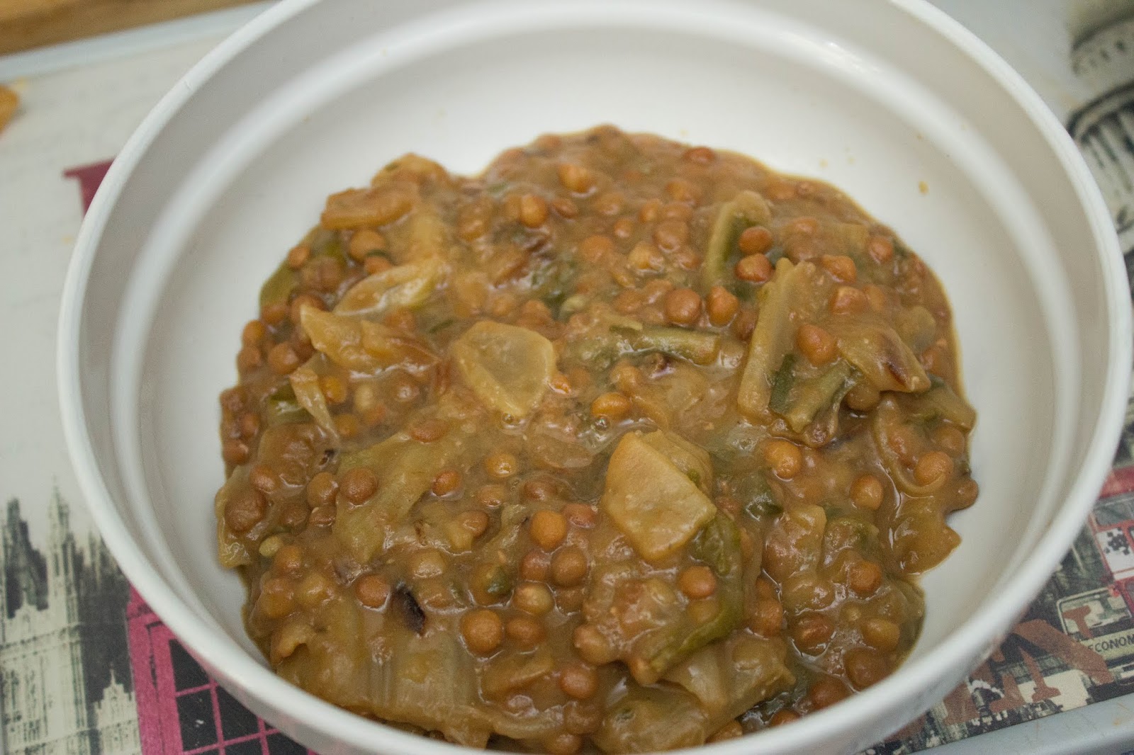 He mantenido la esencia total de la receta, pero por mi falta de tiempo, he utilizado lentejas ya cocidas y acelgas cocidas; todo natural, sin conservantes ni colorantes de Paladar Selecto. Y en lugar de lentejas rojas he usado normales.