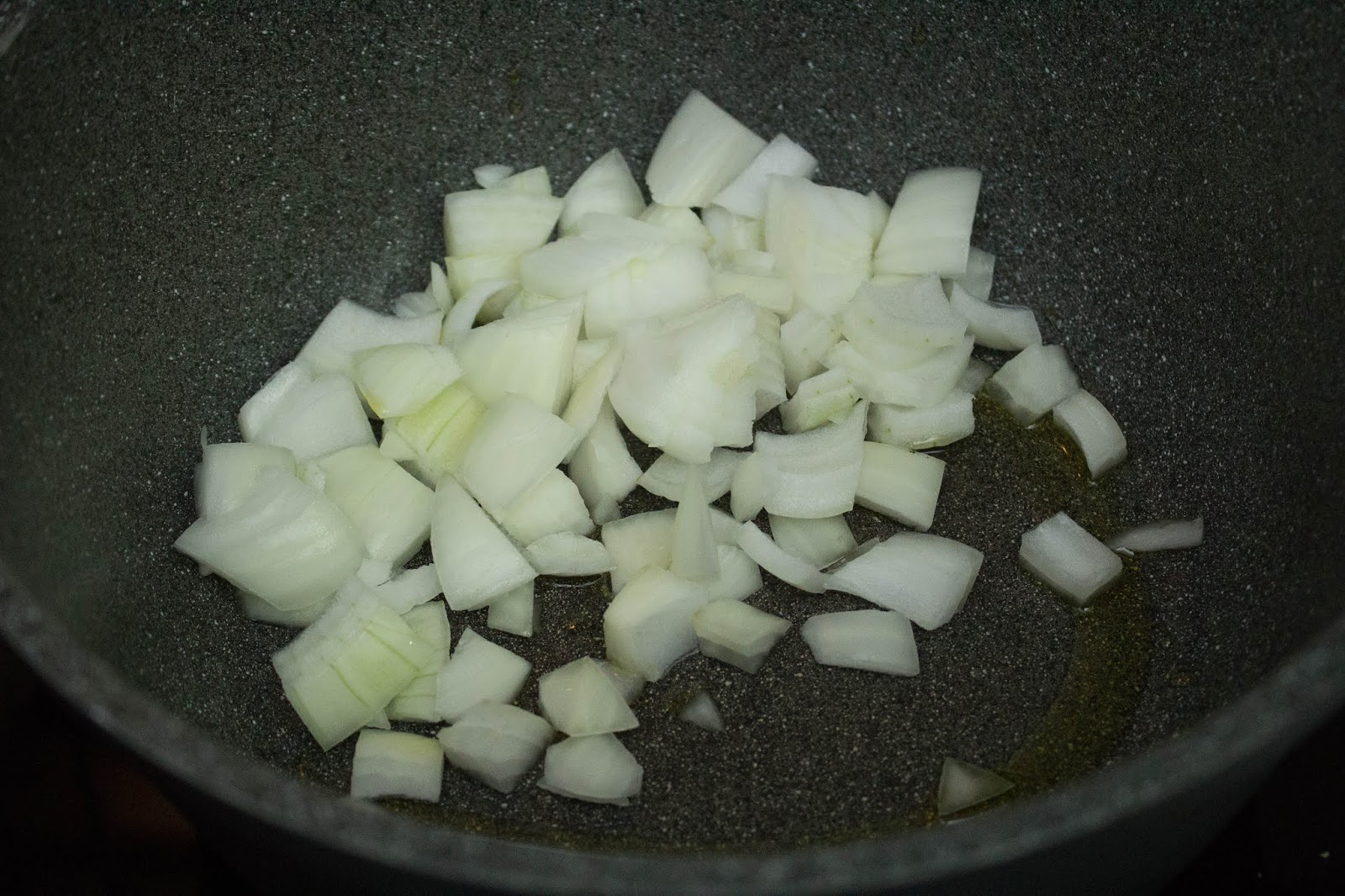 Poner un poco de aceite en la cazuela y cuando empiece a estar caliente, añadir la cebolla. Dorar a fuego medio hasta que esté bien pochada.