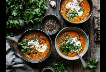 Por qué encaja: Las lentejas son una excelente fuente de proteína vegetal y hierro, las especias tienen propiedades antiinflamatorias y la leche de coco añade cremosidad.