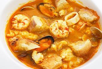 Ya para terminar, serviremos la sopa de marisco en un plato hondo junto con los taquitos de pan tostado.