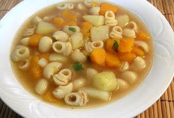Seguidamente verter el caldo caliente y cubrir las patatas con la calabaza por encima unos tres dedos. Remover y dejar cocer 30 minutos, agregando caldo caliente si es necesario.Incorporar la pasta, el perejil picado, agregar más caldo hirviendo, remover con cuidado que no se pegue, cocer 15 minutos, salpimentar al gusto. Si gusta más caldosa la sopa, agregar más caldo caliente.En el momento de servir, retirar el romero. Se puede espolvorear queso parmesano rallado, al gusto de cada comensal.