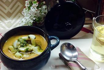 Sopa de aros de calamar. Una sopa muy recomendable que se prepara con un caldo de pescado que reforzamos con unas verduritas pochadas y como ingrediente estrella unos calamares en salsa verde que incorporamos a nuestra cazuela y el resultado es esta sopa maravillosa con sabor a mar. Como toda sopa que se precie si cuando la tenemos preparada la dejamos reposar unas horas el sabor se acentúa y nos queda doblemente apetecible.