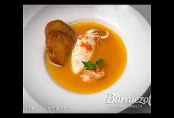 Colar el caldo de pescado y añadir el sofrito preparado. Dejar cocer todo junto durante unos cinco minutos. Apartar del fuego. Corregir de sal y agregar un ajo partido en brunoise y un poco de perejil picado.