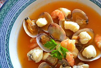 Ponemos de nuevo al fuego, agregamos la maizena y removemos, salpimentamos al gusto.Vamos quitándole a la sopa la espuma que vaya soltando con ayuda de una cuchara y añadimos las gambas peladas, los filetes de pescado y las almejas. Cuando hierva, retiramos la sopa del fuego. Decoramos con hojas de perejil y pimentón dulce.