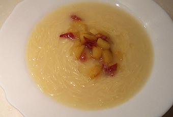 - Una vez tenemos ya la sopa servimos en los platos y añadimos en el centro una cucharada de taquitos de manzana y de beicon.